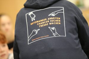 Miteinander arbeiten meint, dass wir alle gemeinsam arbeiten müssen: Schüler mit Schülern, Schüler mit Lehrern, Lehrer untereinander, aber auch Lehrer mit Eltern. Ziehen wir gemeinsam an einem Strang, werden wir viel stärker sein. Arbeiten wir gemeinsam, schafft das Vertrauen. Und das ist sehr wichtig für unsere Schule. Chancen suchen meint einmal, dass wir gute Gelegenheiten nutzen sollen. Bei schlechten Noten sollten wir nicht gleich aufgeben, sondern Möglichkeiten suchen, einen neuen und besseren Weg zu starten. Auch wenn wir Fehler gemacht haben, besteht immer wieder die Möglichkeit eines Neuanfangs.