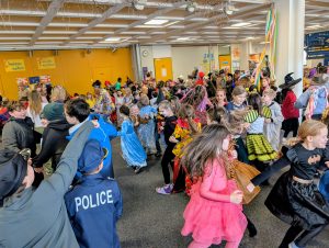 Am Unsinnigen Donnerstag starteten die 1. Klassen die große Polonaise: ein kunterbunter Lindwurm, der durchs Schulhaus zog und dabei jede Klasse „einsammelte“, bis schließlich die Aula erreicht war. Dort wurde fröhlich weitergetanzt – schließlich muss man die närrische Energie ja nutzen!