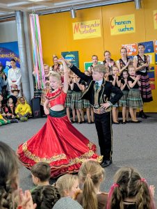 Gegen 11.45 Uhr wurde es dann richtig spektakulär: Die Neubeurer Faschingsgarden legte auf ihrer Inntal‑Tournee einen Zwischenstopp in der Aula ein und zeigte ihre aktuelle Show. Ein Highlight, das jedes Jahr wieder für staunende Gesichter sorgt.